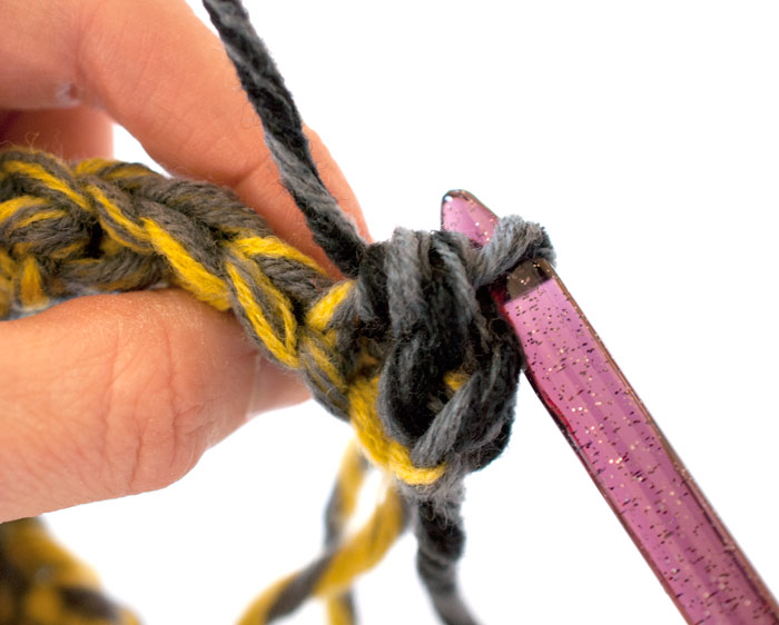 Dies wird von jetzt an Reihe für Reihe wiederholt. Durch das Einstechen hinter der oberen Schlaufe, legen sich die Häkelschlaufen schön auf die Seite und ergeben das schöne zopfige Maschenbild, das charakteristisch für diese Decke ist. Der Farbwechsel erfolgt jetzt mit jeder neuen Reihe.