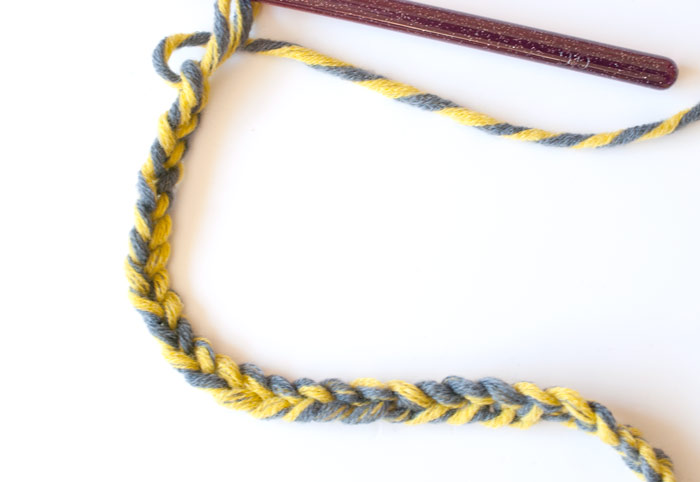 1. Zunächst werden Luftmaschen in Fb.1 angeschlagen – ich habe SEHR LOCKER 90 Maschen angeschlagen. Die Anzahl kannst Du beliebig auf Deine Bedürfnisse abwandeln, z.B. wenn es ein Schal werden soll.