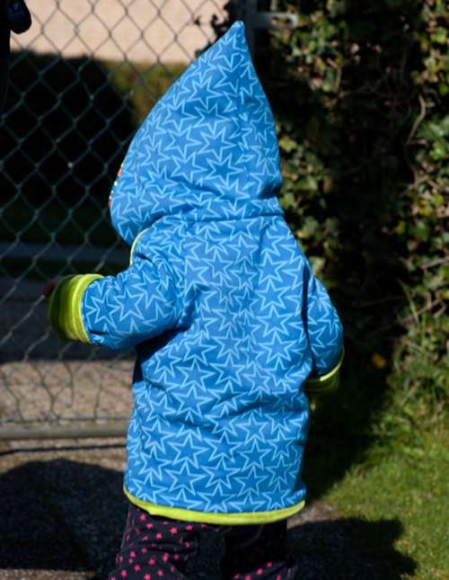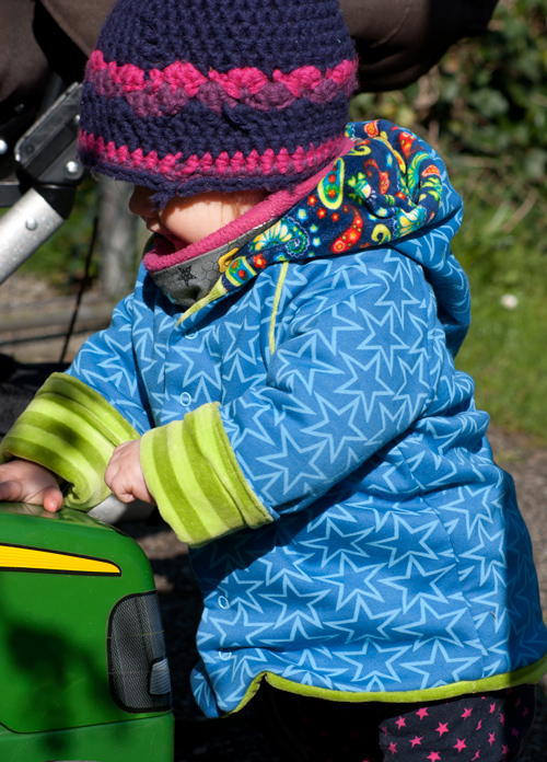 Die Kapuze innen ist aus einem dunkelblauen Paisley-Nicki. Der Hintergrund ist einfach, dass der hellgrüne Nicki nicht reichte. Aber auch von diesem Kompromiss bin ich begeistert – die passen sehr gut zusammen. Übrigens trägt die Kleine auf dem Bild die Häkelmütze, die ich hier schon einmal vorgestellt habe :).