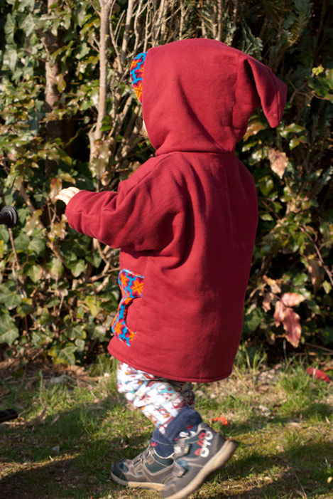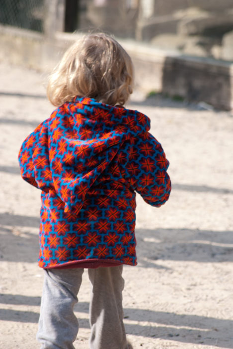 “Wendie” ist ein sehr vielseitiger Schnitt – deshalb ist es umso schöner, dass es diese Wendejacke als Freebook gibt! Sie kann mit Zipfelkapuze oder runder Kapuze genäht werden, es gibt verschiedene Taschenvarianten und mehrere Ärmelabschlussmöglichkeiten. Die Größen sind 74-116, ich habe für Marla Größe 92 genäht.